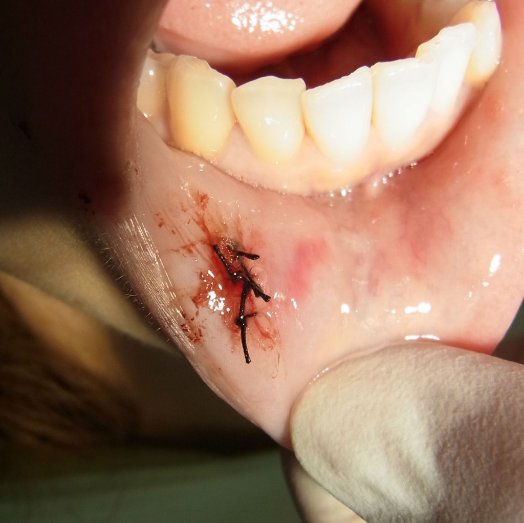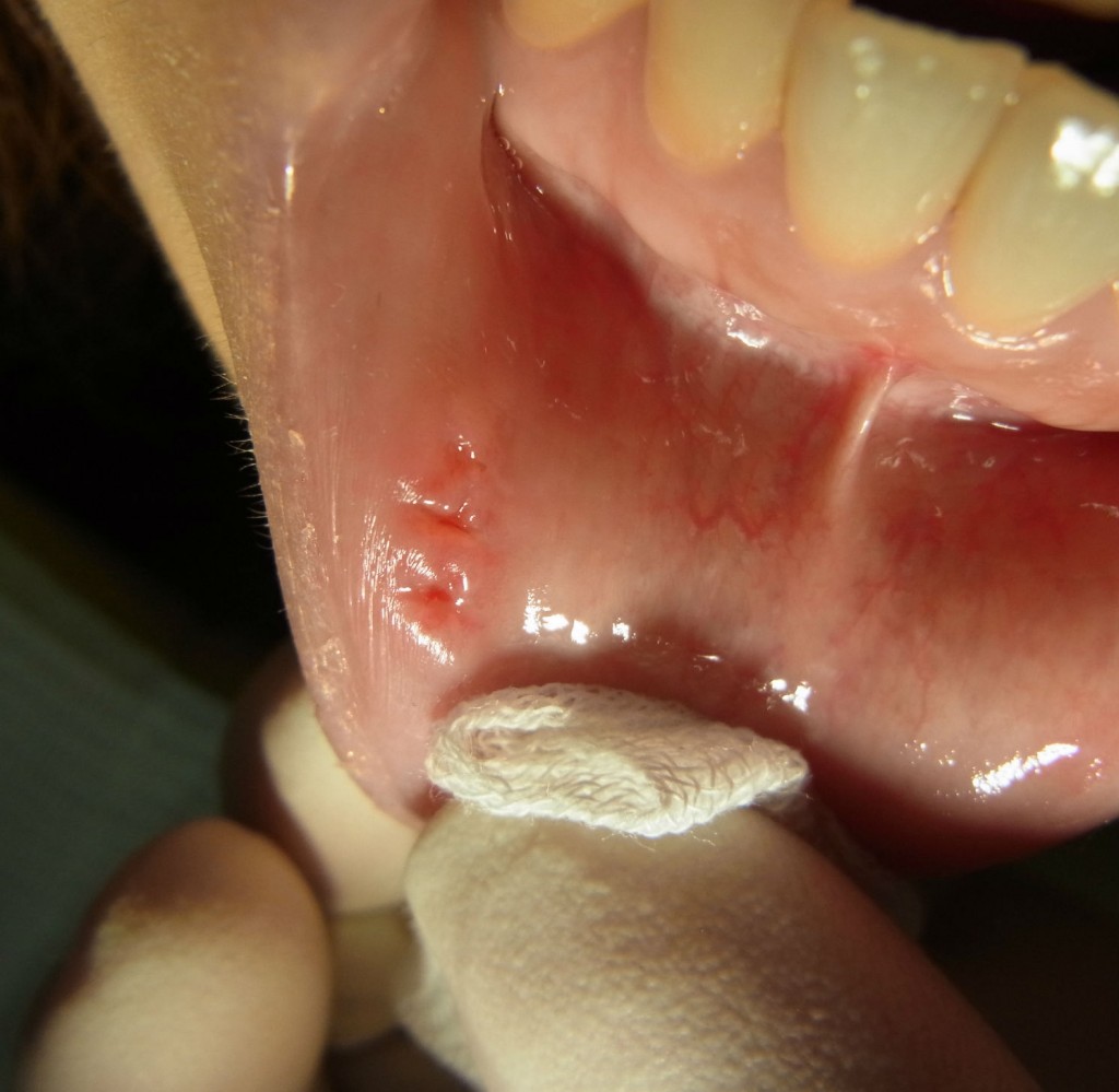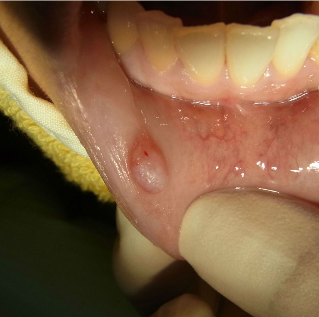 粘液嚢胞 心配していた台風が、この地を去り、徐々に日差しが出てきました。 さて、以前口内炎のレーザー処置についてお話ししました。 口内炎は、とても気になる不快なものですが、お口の中で発生する様々な症状のひとつに粘液嚢胞というものがあります。 舌や舌の下(口腔底)、ほほの内側にできることもありますが、一番よく発生するのは下口唇です。 粘液嚢胞は唾液腺が出口をふさがれて、唾液がたまった状態で、特に痛みもなく小豆大ほどのふくらみになります。 自然に治ることもありますが、再発を繰り返すことが多いとも言われています。 まず抜歯と同様に麻酔をします。そしてメスを使って摘出し、縫合して終了です。 1週間後に抜糸しました。 発見し除去する際は、つぶさないようにして来院ください。 Tweet [`evernote` not found] Check