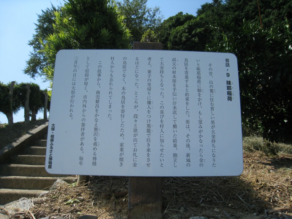 昨日、あまりにもの天気の良さにつられ、暑い中昼食後に散歩に出かけました。 以前から、かよ歯科クリニックの窓から見える赤い鳥居が気になっていたので、それを目指してみようと出発! 窓から見える景色 まずJR三河大塚駅までたどり着きましたが、駅の向こう側にあるので踏切を探しながらプラプラ。 踏切を越えていくと、青々と実るみかんが青空に映えてました。 青いミカン かぼすじゃないですよね?蒲郡といえばミカンのはず… 途中ミカン畑の中を迷いながら右往左往しつつ、駅の裏側に出たところで鳥居の謎が少し判明! 駅近くの大きな看板 ここだ~! 看板 由来説明 「昔話・9 昧耶(まや)稲荷  その昔、山の麓に住む貧しい男が大金持ちになりたいと昧耶稲荷に願をかけ、もし望みがかなったら金の鳥居を寄進すると約束をした。男は、その後、新城の叔父の材木屋を手伝い汗水たらして働いた結果、独立して大金持ちになった。この喜びを村人に知らせたいと考え、妻子の里帰りに傭人をつけ駕籠で往き来をさせるほどになった。ところが、段々と欲が出てお礼に金の鳥居でなく、木の鳥居を寄付したため、家業が傾き村人からも忘れられてしまった。  この故事から、商売繁盛をかなえ贅沢を戒める神様として信仰が厚く、市内外からの参拝者がある。毎年三月午の日には大祭が行われる。 大塚・相楽ふるさと博物館」 う~む、奢れるもの久しからず… そして、かよ歯科クリニックから見えたあの赤い鳥居をくぐります。 振り返ると大塚のミカン畑や家々、その向こうには三河湾を眺めることができて、とても気持ちいいです。 赤い鳥居 鳥居近辺からの眺め 鳥居からどんどん山道になり、ちょっとこれは散歩じゃなくなりそうだったので(^_^;)次回しっかり準備してからにしようと帰路につきました。 あとでネットで調べたら、大塚には古墳もあったり城もあったり、結構歴史があるんだな~と思いました。 でも大塚に生まれ育って30云年のスタッフは、昧耶稲荷のことを知りませんでした。 これから時々大塚探検して、掘り下げていこうかと思います!(^^)! 次回は、まず昧耶稲荷の最終地点へGo!です♪