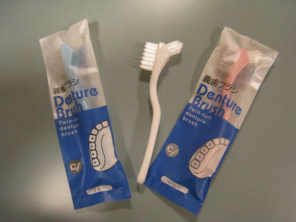 普段使用している歯ブラシでもいいですが、入れ歯専用ブラシ(かよ歯科でも販売しております)もあります。