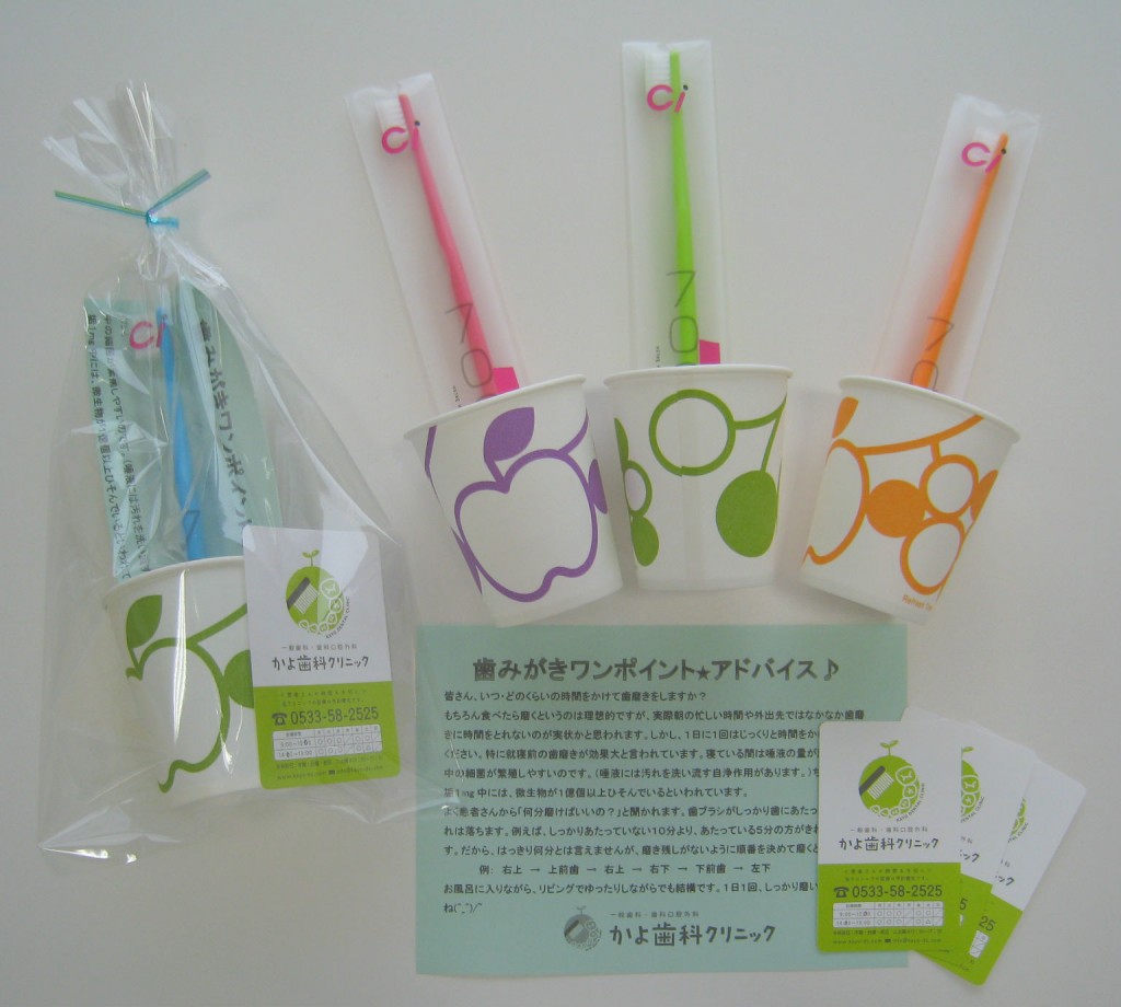 歯ブラシを「歯磨きワンポイントアドバイス」付きで紙コップに入れ、かわいくラッピングしました(*^_^*)
