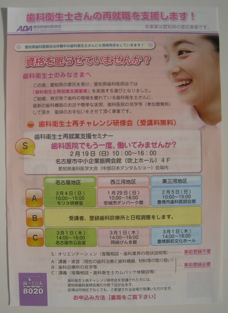 そんな資格を眠らせている方に、今愛知県の委託を受けて愛知県歯科医師会では『歯科衛生士再就業支援事業』を展開しております。